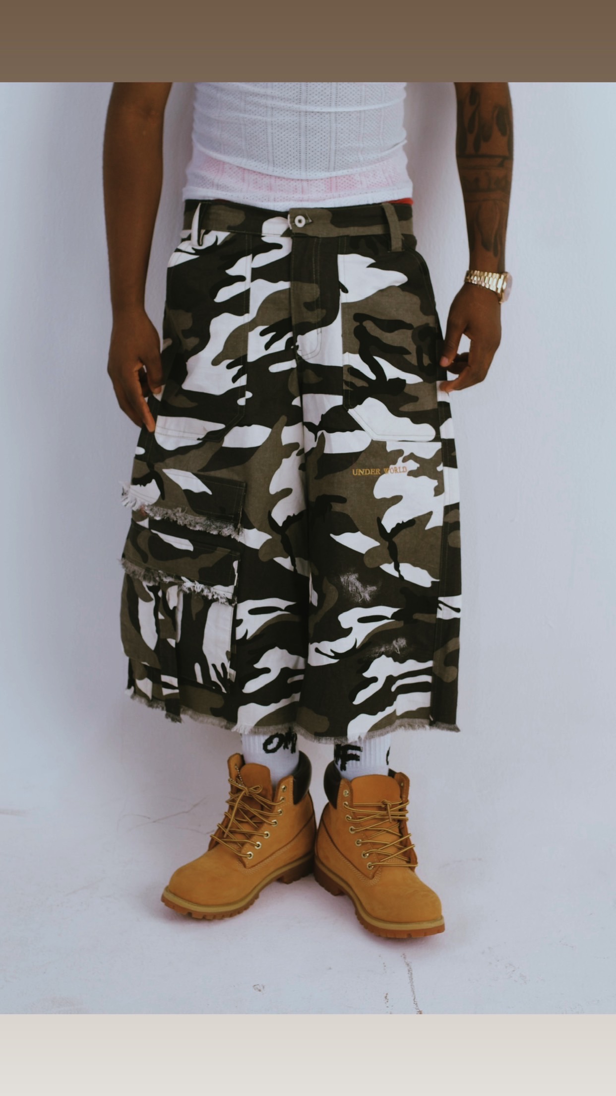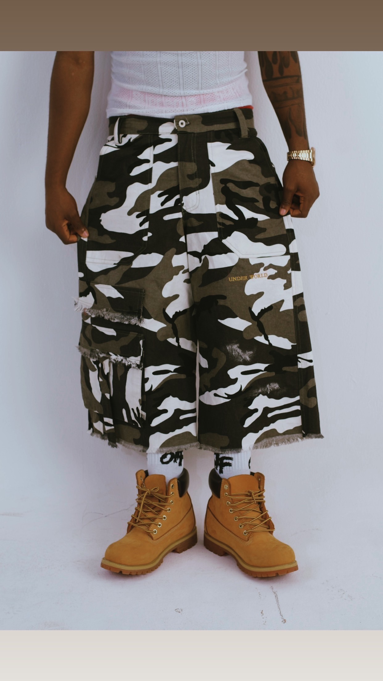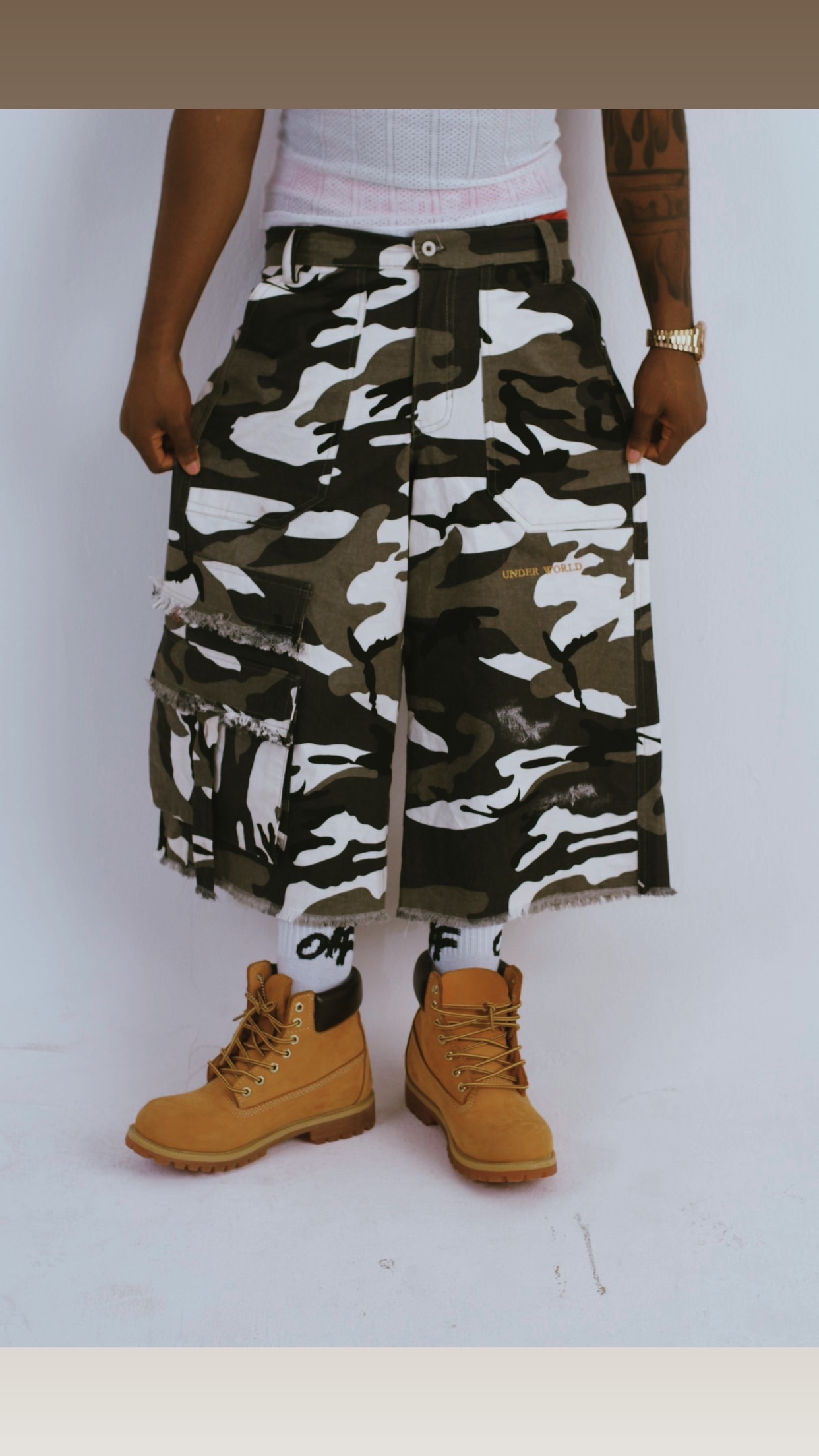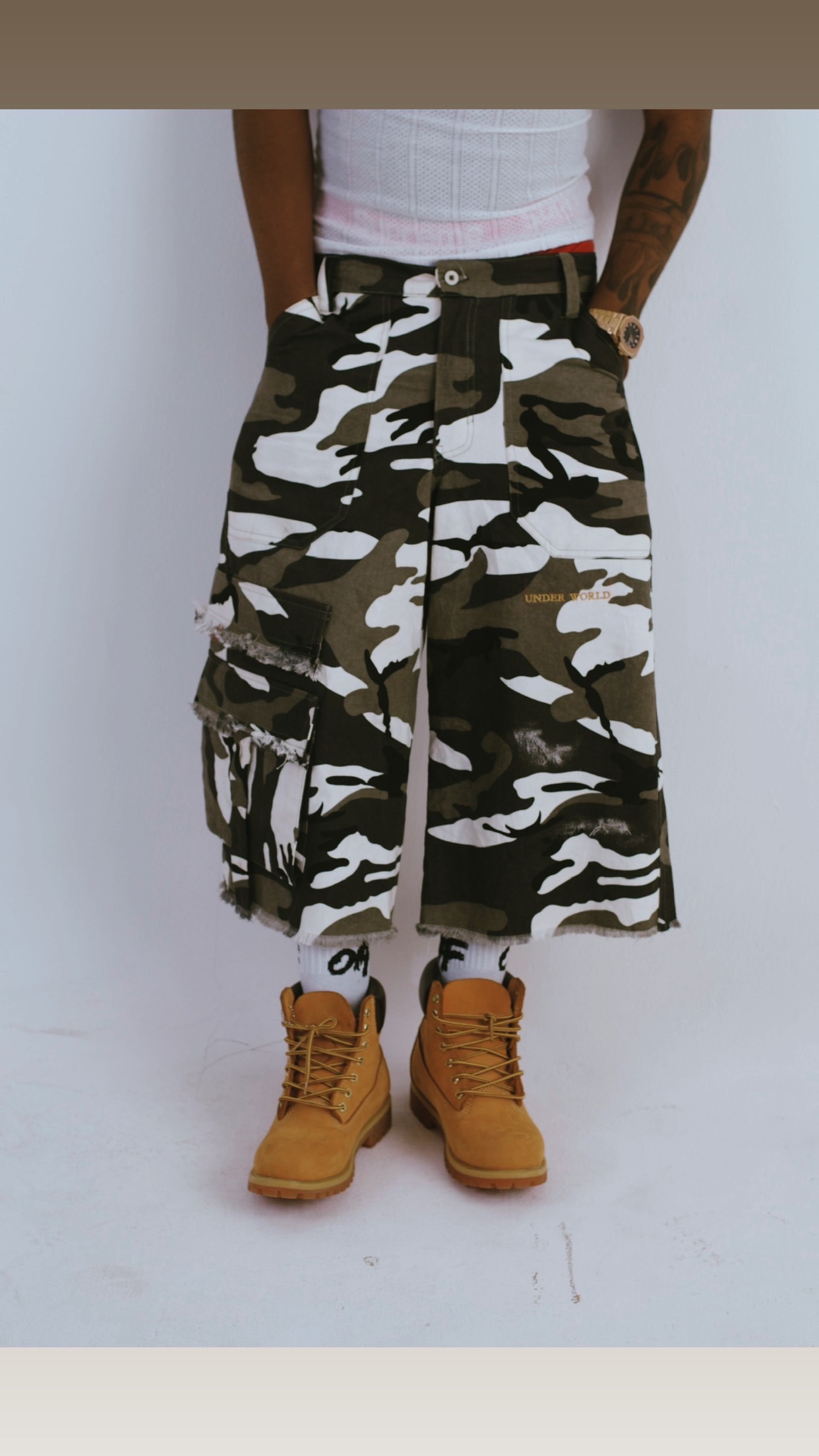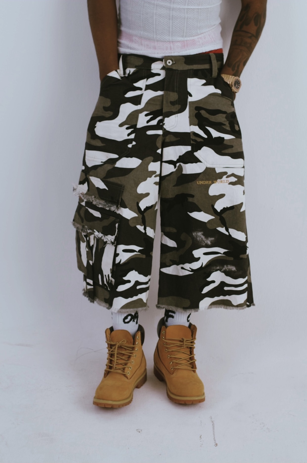 The UNDERWORLD Camo Jorts bring a bold camo finish with a durable, heavyweight feel and a relaxed, confident fit. Reinforced stitching and clean detailing give it that sharp UNDERWORLD edge — rugged, functional, and always ready.